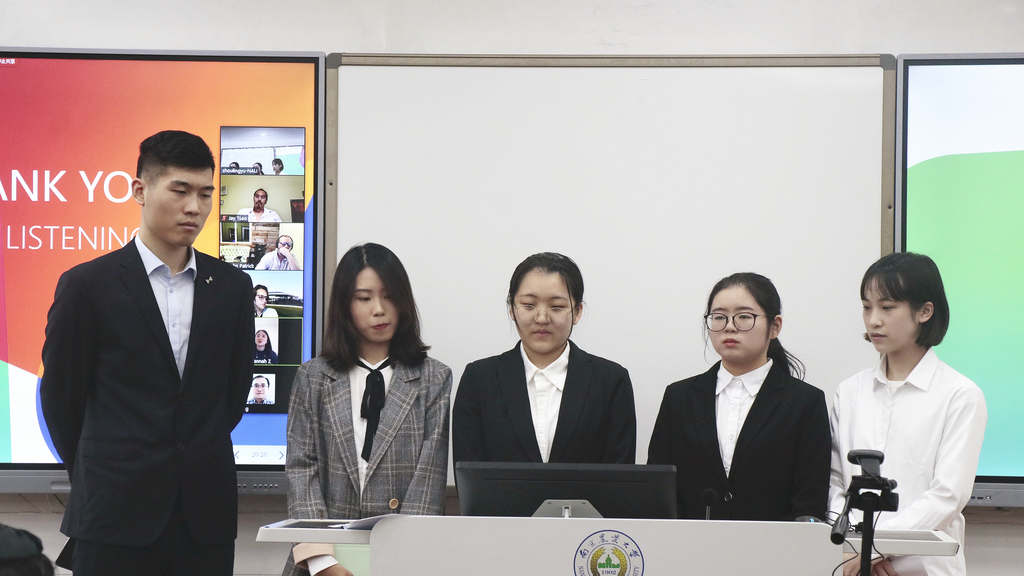 历时5周、40课时的线上访学,在老师们的帮助下,同学们实现了从适应、调整到自我突破的飞跃。40位同学分成八个小组,分别进行了结业答辩,每个小组自行设计创意产品,将五周所学知识投诸实践运用。勤劳农民APP、插入式扩展坞、可循环发热垫、面膜伴侣、隔音耳套、改良电池、多功能折叠烘干机。同学们结合周边、立足时代,以受众需求为导向,由小见大、奇思妙想。流利的英文表达,大方地与老师畅谈交流,评委老师们对每个团队进行了细致地点评和指导。