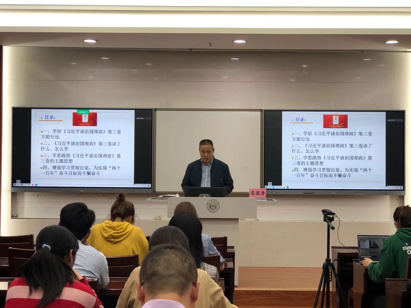 吴国清教授以“站在新的历史起点上学思践悟习近平治国理政思想”为题,为我们系统阐述《习近平谈治国理政》(第三卷)主要内容,以及学习方法,揭示了“学好《习近平谈治国理政》方能远行”的真理,鼓励全体党员增强自觉学习意识,为实现“两个一百年”奋斗目标而不懈奋斗。