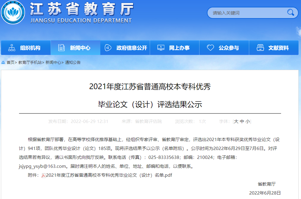 近日,江苏省教育厅公布了2021年度江苏省普通高校本科优秀毕业论文(设计)评选结果,线上赌博平台